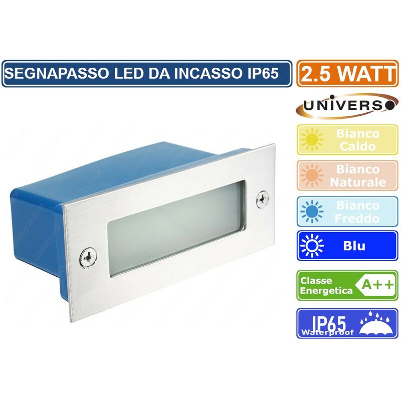 Faretto LED Segnapasso da incasso con potenza di 2.5W. Forma rettangolare realizzato in Alluminio di colore nichel effetto spazzolato. LED SMD con fascio luminoso di 120°, flusso luminoso di 150 lm. Grazie al grado di protezione IP65 può essere installato anche all'esterno, ideale per illuminare scale, zone di passaggio di giardini ed edifici. Questo faretto segnapasso si connette facilmente alla rete grazie al driver incluso. Questo modello di faretto LED da incasso è disponibile con 3 diverse temperature colore: Luce Bianca Calda 3000K, Bianca Naturale 4000K, Bianca Fredda 6000K e Blu Dimensioni: 110 x 45 x 55 mm.