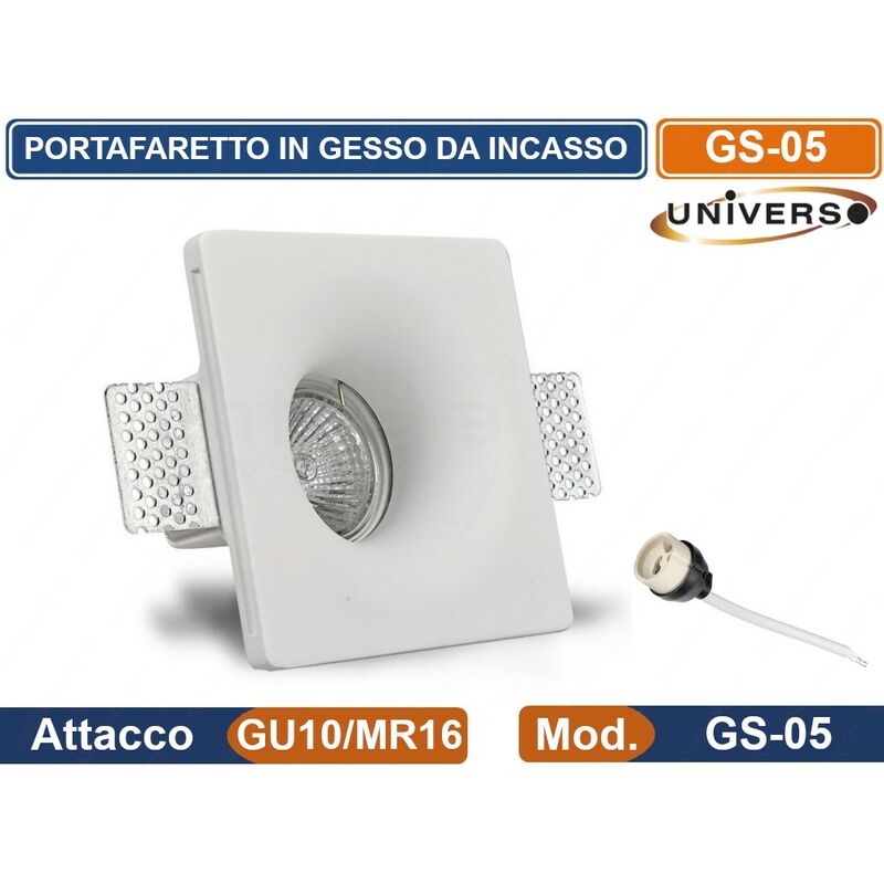 Supporto Quadrato da incasso per faretti. Realizzato in Gesso di colore Bianco con copertura in vetro satinato . Portafaretto adatto ad essere inserito in controsoffitti, con la possibilità di essere verniciato ed ottenere un effetto a scomparsa. Compatibile con tutti i tipi di lampade con Ø 50mm (standard faretti GU10 o GU5.3). Nella confezione è compreso un anello per il bloccaggio della lampadina ed il portalampada ceramico GU10. Dimensioni: 120 x 120 x 45 mm. Tipologia Installazione