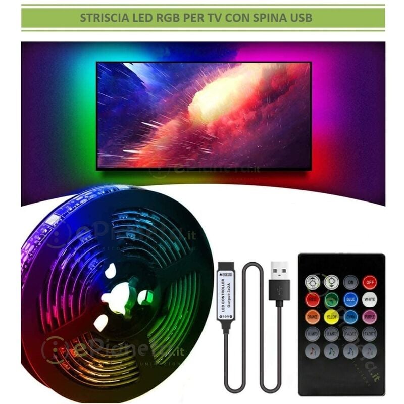 Strip led RGB con cavo USB collegabile direttamente alla TV e controllabile comodamente a distanza con telecomando, munita di 16 modalità statiche, 4 modalità dinamiche, regolazione della luce, scelta del colore e della musica. Il montaggio è pratico grazie all'adesivo posto sul retro e facilmente piegabile. Collegata a un adattatore USB, permette l'installazione anche su armadi e mensole. Caratteristiche tecniche 3m Potenza 5w/m Tensione di ingresso DC 5V Fascio luminoso 120° Colore luce RGB Quantità led 30/m Taglio Lungo i segni di taglio (ogni 10cm) Dimmerabile Si Impermeabilità IP65 Dimensioni Lunghezza 3 m Larghezza 10 mm Caratteristiche tecniche 5m Potenza 5w/m Tensione di ingresso DC 5V Fascio luminoso 120° Colore luce RGB Quantità led 30/m Taglio Lungo i segni di taglio (ogni 10cm) Dimmerabile Si Impermeabilità IP65 Dimensioni Lunghezza 5 m Larghezza 10 mm