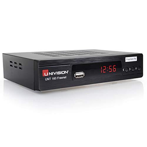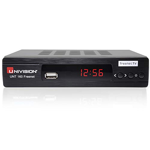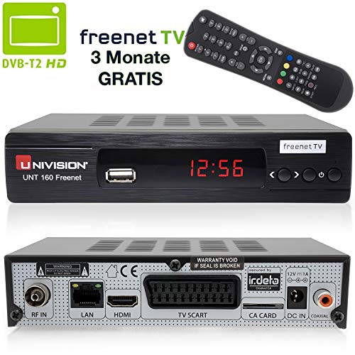 Univision UNT160 - Ricevitore digitale DVB-T2 con antenna, incluso TV Freenet 3 mesi (H.265, HDMI, SCART, USB, LAN), colore: Nero