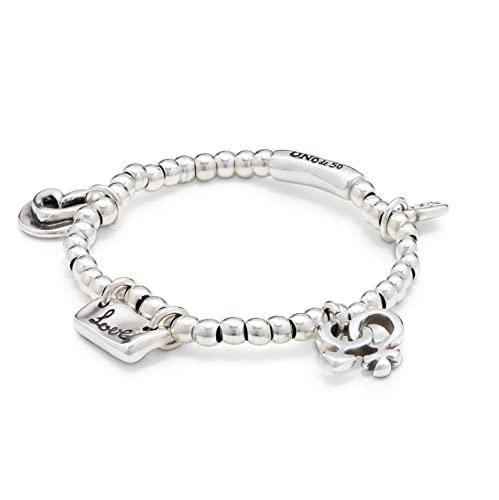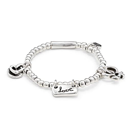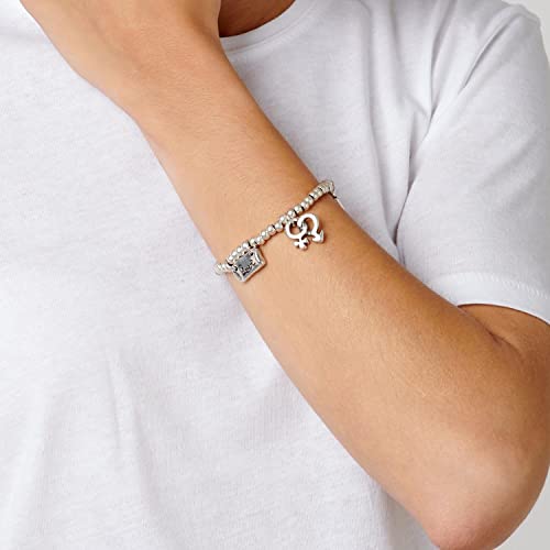 “Bracciale elastico composto da perle di metallo bagnato in argento, il simbolo maschile e femminile, un cuore e una piastrina con il testo "Love".