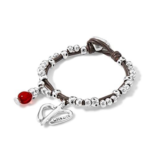 Bracciale dallo stile informale per i tuoi look quotidiani composto da tre strisce di cuoio marrone ricoperte da anelli regolari in metallo bagnato nell'argento e chiusura a bottone.