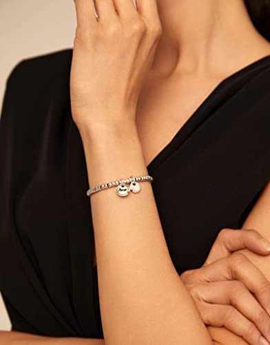 Originale bracciale elastico da donna in metallo argentato, con perline arrotondate e una perlina con incisa la parola "Amor".