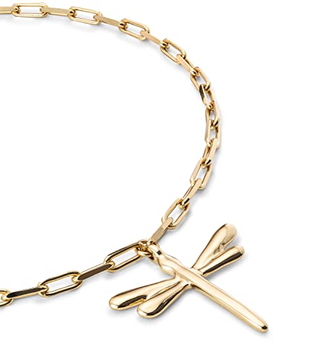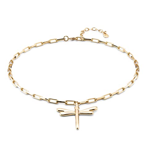 Collana corta con catena di cerchi piccoli in metallo bagnato nell'oro e rifinita con un pendente dalla forma di libellula di media grandezza.