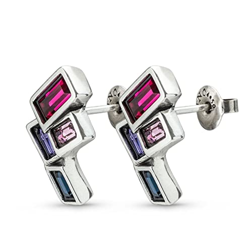 L'esclusiva collezione Euphoria presenta questi simpatici orecchini dalla forma geometrica, di metallo bagnato nell'argento con cristalli sfaccettati multicolore incastonati.