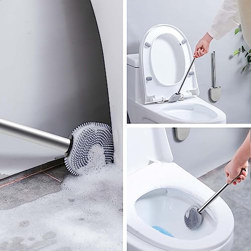 [Testa dello scopettino bagno in silicone] Facile da pulire i punti morti: Il set di scopino wc da 4 pezzi è realizzato con manico in acciaio inossidabile di alta qualità e testa in TPR, che non si deforma facilmente e non aggroviglia i capelli, adatto per la pulizia dei punti morti. La testina piatta dello scopino può essere piegata per adattarsi perfettamente all'angolo del bordo per arrivare sotto il bordo.