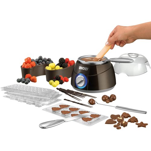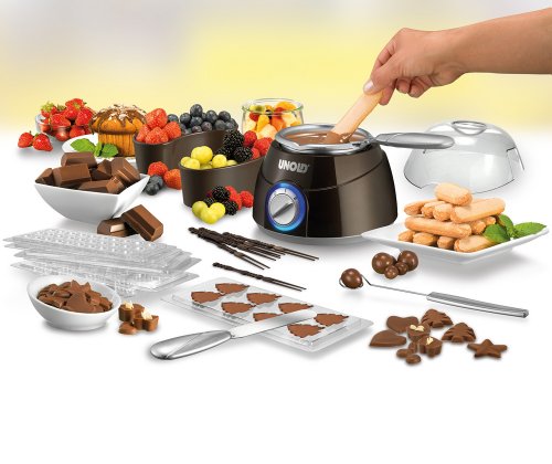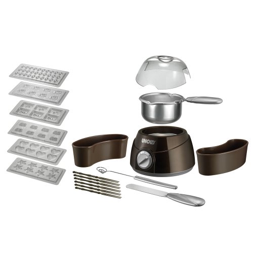 Anche il proprio schokoladen-kreationen è molto semplice e l'Schmelztopf rimovibili in alluminio rende il versamento di liquidi, cioccolato in 6 diversi stampi con le forme è un gioco da ragazzi