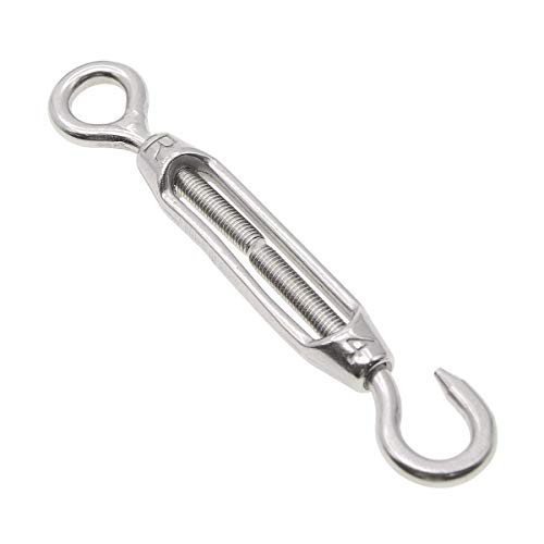 Tenditore in acciaio inox con gancio e estremità con occhielli, utilizzato in linee di costruzione elettriche e a binario.