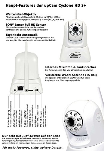 UpCam Cyclone HD - Telecamera IP con visione notturna (HD 1280 x 960, WLAN, audio, app, scheda SD, Cloud, obiettivo grandangolare 1,3 MP) - produttore tedesco, bianco, CYCLONE1W4EUR