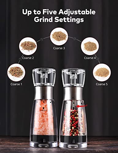 Updata - Set di 2 macinini per sale e pepe professionale, realizzati in acrilico e acciaio INOX, regolabili e ricaricabili, adatti a casa, cucina, grill