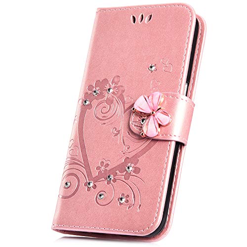 Uposao Compatibile con Galaxy J3 2017 Custodia,Brillantini Portafoglio - Bling Glitter Strass Cover in Pelle Colorata Cuore Farfalla 3D Disegno Libro Antiurto Supporto Copertura Case,Oro Rosa
