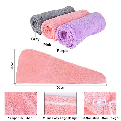 URAQT Asciugamano Per Capelli, 3 Pcs Asciugamani Capelli a Turbante, Cappuccio per Capelli Secchi Super Assorbente, Asciugatura Rapida per Capelli Bagnati, Asciugamani da Doccia con Bottoni
