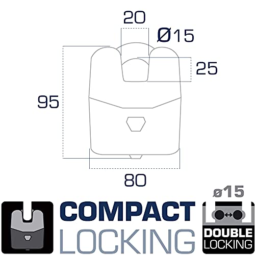 Lucchetto di massima sicurezza ad arco ø15 con doppia chiusura. Alto livello di sicurezza 20, testato contro sega, cesoia, martello, leva... Perfetto per la sicurezza di cancelli, garage, container, combinazione con catena per moto e scooter.