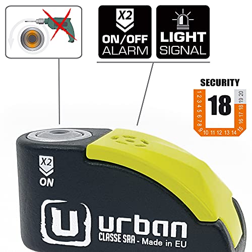 Urban Security UR10 Lucchetto Antifurto Moto Bloccadisco Alta Sicurezza con Allarme 120dB + Warning, A +, Doppia Chiusura Ø 10, omologato Sra, Made in EU