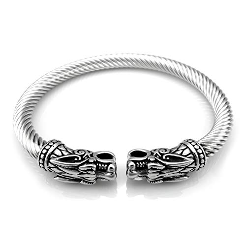 Braccialetto vichingo in acciaio inossidabile con le teste dei lupi di Odino Geri & Freki.