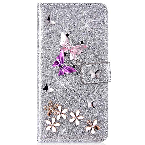 Urhause Glitters Cover Compatibile con Huawei Mate 10 PRO Farfalla Brillantini Strass Diamante Bling Custodia in Pelle Libro Flip Portafoglio PU Slot per Schede Kickstand Protettiva Case,Argento