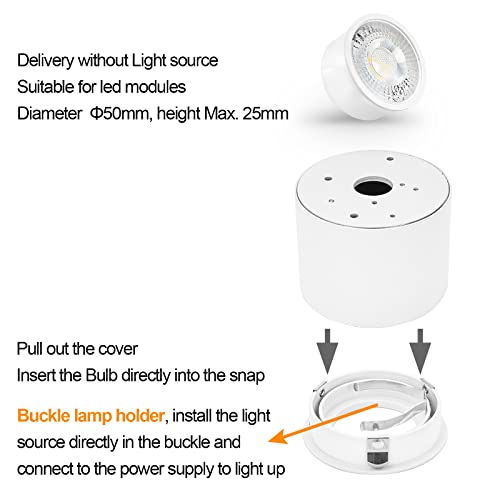 【Faretti a montaggio superficiale 230V】: la dimensione del lampada da soffitto è Φ80 x 50 mm e la fibbia a molla incorporata viene utilizzata per fissare la sorgente luminosa a LED. 230V, nessun trasformatore o driver richiesto, installato direttamente. Downlight di alta qualità e prezzo basso, garanzia di qualità.