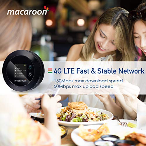 【4G Rete stabile e privata】 Dispositivo WiFi da viaggio Macaroon propria rete ad alta velocità 4G LTE. Raggiunge fino a 150 Mbps di velocità di download e 50 Mbps in upload di uno, per guardare film HD senza interruzioni, scaricare file in pochi secondi e tenere una chat video senza interruzioni. Nel frattempo, l'amaretto protegge la tua privacy quando naviga in internet. È il tuo viaggio perfetto per viaggiare.