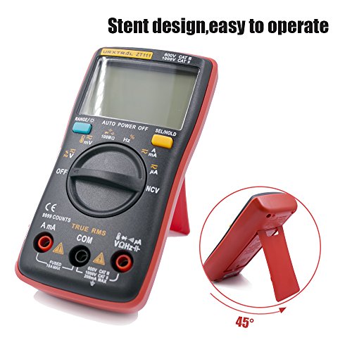 Design con supporto speciale: il retro del multimetro ha un supporto, che ti fa posizionare il dispositivo a 45 gradi di angolazione e ti fa leggere o schermo con facilità, liberandoti,allo stesso tempo, le mani. Il supporto è duraturo, con materiali speciali ed un ottimo design, non è facile danneggiarlo.