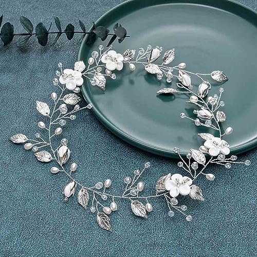 Ushiny Fiore Sposa Matrimonio Capelli Vite Argento Perla Lunga Fascia Foglia Stilista Accessori per capelli per donne e ragazze