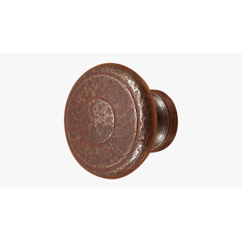 Pomolo per serramento interno-esterno completo di particolare di fissaggio (fisso singolo+bullone passante). Materiale ferro. Finitura ferro verniciato (ruggine) . Dimensione diametro pomolo mm.70.