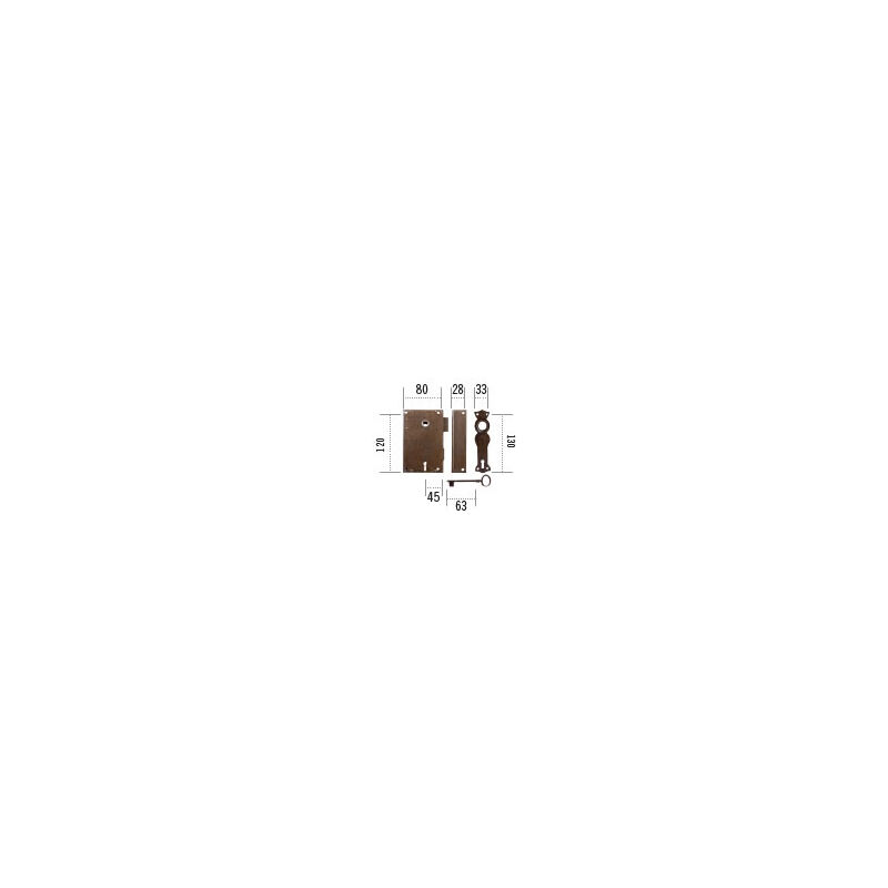 Serratura per porta interna da applicare a redosso a scatola in ferro completa di chiave,bocchetta esterna e riscontro. Entrata mm.45 Q.8. Maniglia non inclusa. Versione sinistra. Finitura ferro verniciato (ruggine).