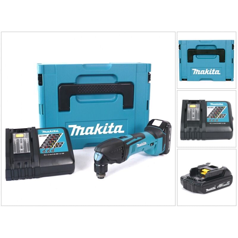 Dotazione: - 1x Makita DTM 50 Z Multi-Tool 18V alimentato a batteria - 1x Batteria BL 1815 18 V - 1,5 Ah - 1x Caricabatterie rapido DC 18 RC - 1x Valigetta da trasporto Makpac 2 - 1x Inserto MakPac Descrizione prodotto: L'utensile multifunzione a batteria DTM 50 è stato progettato per tagliare legno, plastica, gesso, metalli non ferrosi e elementi di fissaggio (ad es. chiodi e graffette non temprati). È inoltre indicato per la lavorazione di piastrelle morbide, nonché per la levigatura a secco e la raschiatura di piccole superfici. È perfetto per lavorare vicino ai bordi e tagliare a filo. L'utensile è dotato di una luce LED per un'illuminazione ottimale, sulla punta dell'utensile e nell'area di lavoro, che facilita il lavoro in modo più confortevole. Inoltre, il suo design compatto e il lavoro senza perdita di coppia a basso consumo energetico garantiscono un lavoro molto pratico. La batteria ricaricabile compatta ed extra leggera Makita BL 1815 N può essere ricaricata in soli 15