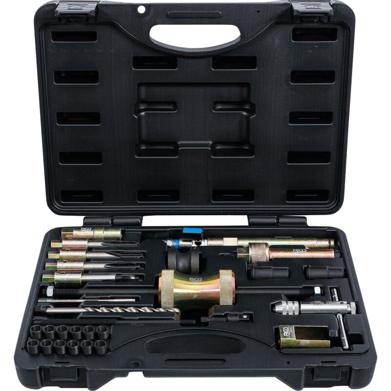 Permette di rimuovere candele di preriscaldamento bruciate, corrose o rotte Le filettature di montaggio possono essere riparate senza dover smontare la testa del cilindro La filettatura originale difettosa M10 x 1 viene riparata inserendo un manicotto filettato Adatto per i motori Mercedes-Benz CDI della serie OM 611, 612, 613, 628, 646 (non EVO), 647, 648 Oggetto della fornitura: Estrattore e martello a percussione per rimuovere le candele di preriscaldamento incastrate e rotte Alesatori per alesare la filettatura difettosa Filettatrice M10 x 1 e M12 x 1 Bussole di centraggio per alesatori e filettatrici Trapano speciale a gradini e filettatrice per alesare le candele di preriscaldamento strappate 12 boccole di riparazione per filetti M12 x 1 su M10 x 1 Adattatore aria compressa Peso del tessuto 3.832 Dimensioni dell'imballaggio 1 Peso lordo 3832 g