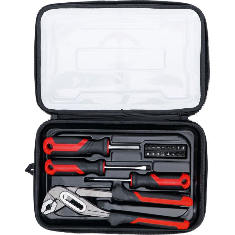 In borsa ribaltabile a cerniera con coperchio trasparente Oggetto della fornitura: 1 cacciaviti intaglio piatto 5 mm, lunghezza della lama 75 mm 1 cacciavite, intaglio a croce PH1, lunghezza della lama 75 mm 1 pinza a pappagallo, 240 mm, giunto a cassetta, Filettatura perforante 1 impugnatura portainserti, quadro esterno 6,3 mm (1/4), 160 mm 16 inserti: 4 inserti, esagono esterno 6,3 mm (1/4) intaglio piatto: 3 - 4 - 5 - 6 mm 4 inserti, esagono esterno 6,3 mm (1/4), Intaglio a croce PH: PH0 - PH1 - PH2 - PH3 4 inserti, esagono esterno 6,3 mm (1/4), Intaglio a croce PZ: PZ0 - PZ1 - PZ2 - PZ3 4 inserti, esagono esterno 6,3 mm (1/4) esagonale esterno: H2 - H2,5 - H3 - H4 mm Imballaggio adatto per essere appeso alla parete Ja Peso del tessuto 0.94 Dimensioni dell'imballaggio 1 Peso lordo 940 g