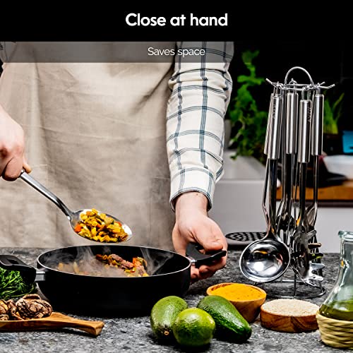 ✔️ Set di utensili da cucina con supporto: gli utensili da cucina si trovano su un pratico supporto in filo di acciaio. Il porta utensili mantiene tutto organizzato.