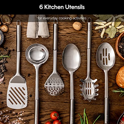Axer Set di 6 utensili da cucina in acciaio inox con supporto - Include cucchiai solidi e a fessura, Mestolo, Paletta e Schiacciapatate - Lavabile in lavastoviglie - Argento