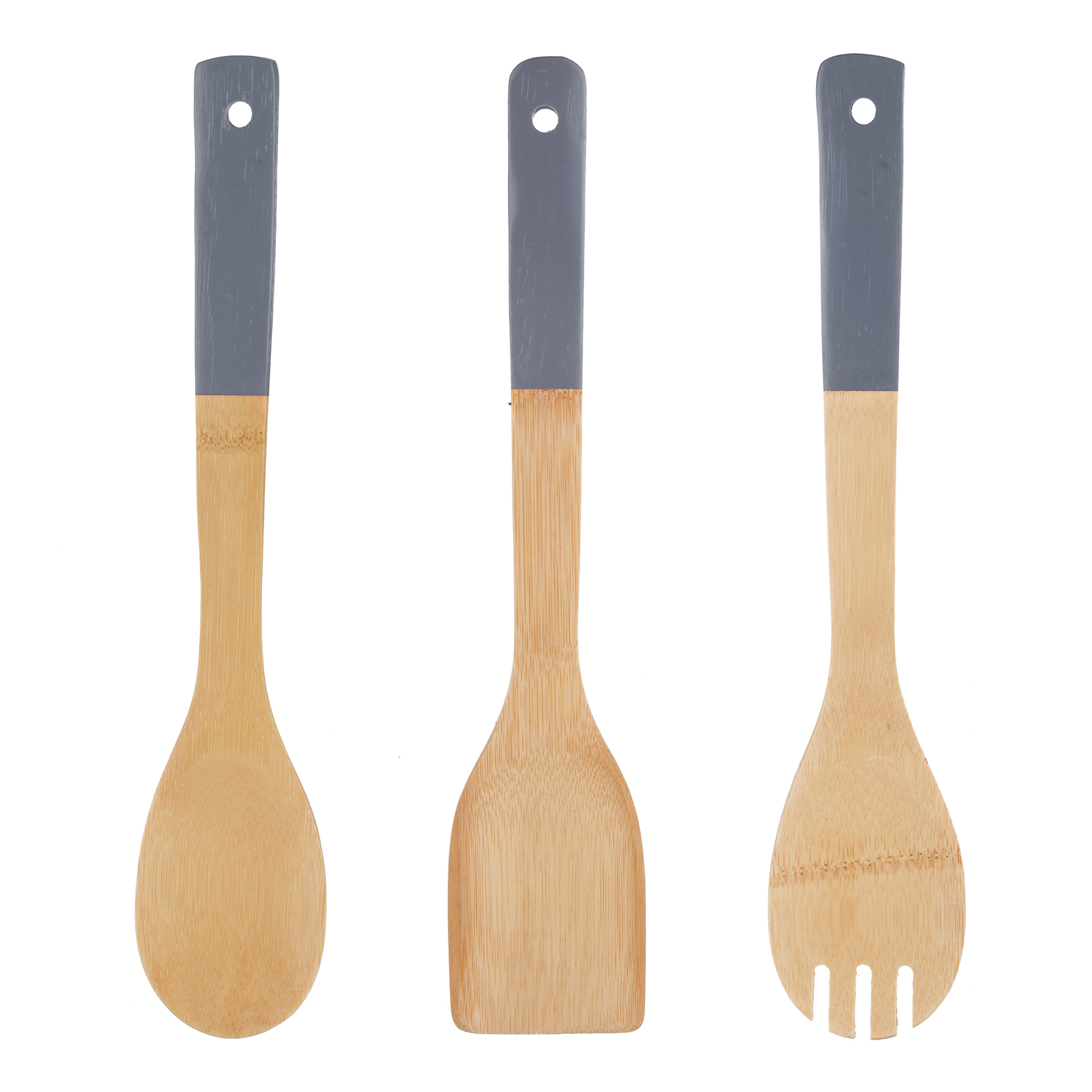 Un set da cucina completamente in bamboo con colorati inserti grigi, perfetto per cucinare senza rischiare di graffiare o rovinare il fondo delle tue pentole. Potrai infatti utilizzarli senza difficoltà durante qualsiasi preparazione. Il bamboo, materiale versatile e resistente, è perfetto per cucinare senza rischiare spiacevoli scottature. Si consiglia il lavaggio a mano. Dimensioni cucchiaio: 30x6 cm. Dimensioni forchetta: 30x6 cm. Dimensioni spatola: 30x6 cm.