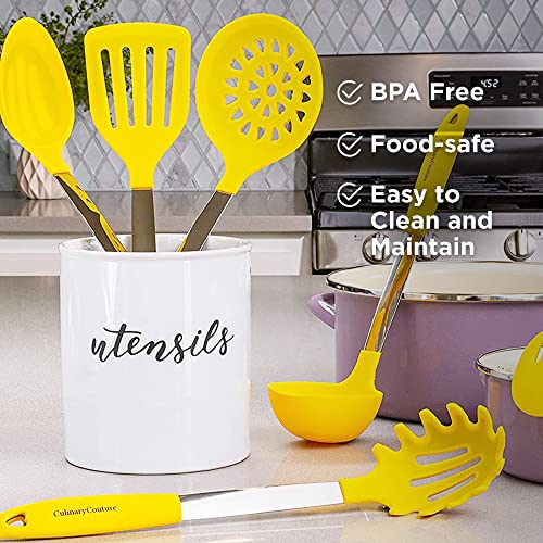 Yellow Cooking Utensil Set - Stainless Steel & Silicone Heat Resistant Professional Kitchen Tools - Spatula, Mixing & Slotted Spoon, Ladle, Pasta Fork Server, Drainer - Bonus Ebook!