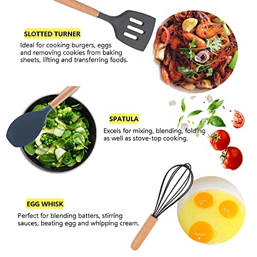 Set di utensili da cucina, 12 pezzi di utensili da cucina, in silicone di grado alimentare sicuro con manici in legno di alta qualità, spatola antiaderente resistente al calore