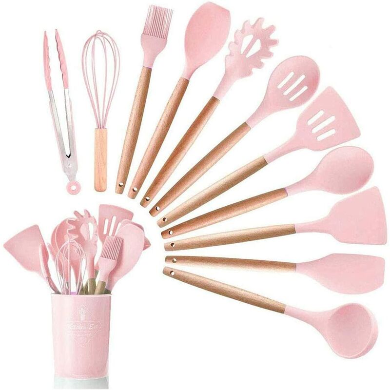 Set da cucina professionale - Il set di utensili da cucina da 11 pezzi include cucchiaio forato, cucchiaio, cucchiaio per pasta, mestolo, spatola scanalata, piatto girevole solido, spatole in silicone, spazzole in silicone, frusta e pinze da cucina. 【Resistente al calore】 Questo set di posate da cucina in silicone può resistere a temperature fino a -446 ° F / 230 ° C. I manici in legno non sono caldi come quelli in metallo e sono molto leggeri e comodi da impugnare. Le proprietà antiaderenti e antimacchia assicurano una facile pulizia. 【Manico in legno premium】Manici in legno leggeri e rinnovabili proteggono dalla ruggine e dallo scongelamento. Ogni manico in legno ha un foro per appenderlo per riporlo comodamente utilizzando ganci o un supporto a parete. 【Non caustico e durevole】 Gli utensili da cucina in silicone sono composti da due parti, il manico in legno e le punte in silicone di alta qualità che hanno vinto non si scioglie o si piega come gli utensili di plastica e non