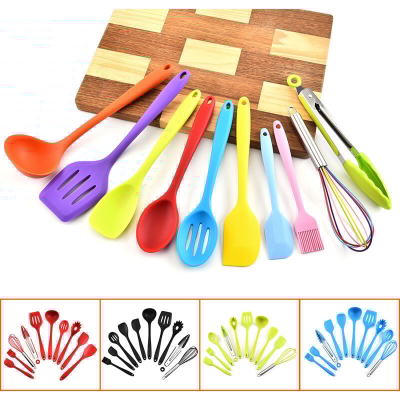 Colore: multicolore/rosso / nero / verde / blu (opzionale) /strong> 1 * Set di utensili da cucina (10 pezzi) ( Multicolore: mestolo, spatola scanalata, cucchiaio forato, spatola grande, spatola piccola, cucchiaio, pinza, pennello imbastitura, frusta, cucchiaio Rosso/Nero/Verde/Blu: mestolo a cucchiaio, paletta a fessura, schiumarola, spatola grande, spatola piccola, cucchiaio, pinza, pennello imbastitura, frusta, paletta per pasta)