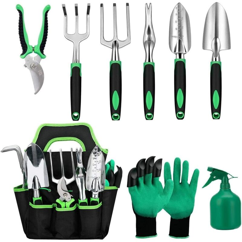 Set di giardinaggio multifunzione [Un set completo di strumenti di giardinaggio I nostri strumenti di giardinaggio includono 9 strumenti. Riceverai sei strumenti a mano, un sacchetto di trasporto, un paio di guanti da giardinaggio e uno spruzzatore. È ideale per varie attività come dimensioni, scavature, diserbanti, arredi del suolo, ventilazione e trapianto. Può soddisfare tutte le tue esigenze di giardinaggio. [Lega di alluminio di alta qualità] Il kit di attrezzi da giardinaggio è realizzato in lega di alluminio di alta qualità con elevata durezza. Non è necessario preoccuparsi di ruggine e danni durante l'uso, il giardinaggio può essere fatto più facilmente. Il regalo perfetto per gli amanti degli uomini e delle donne. [Guanti protettivi e spruzzatore di plastica] Guanti da giardino confortevoli e versatili, con 4 forti artigli di plastica ABS, è possibile scavare facilmente e piantare senza attrezzi, che possono proteggere le mani da graffi e tagli. Le pompe manuali e gli