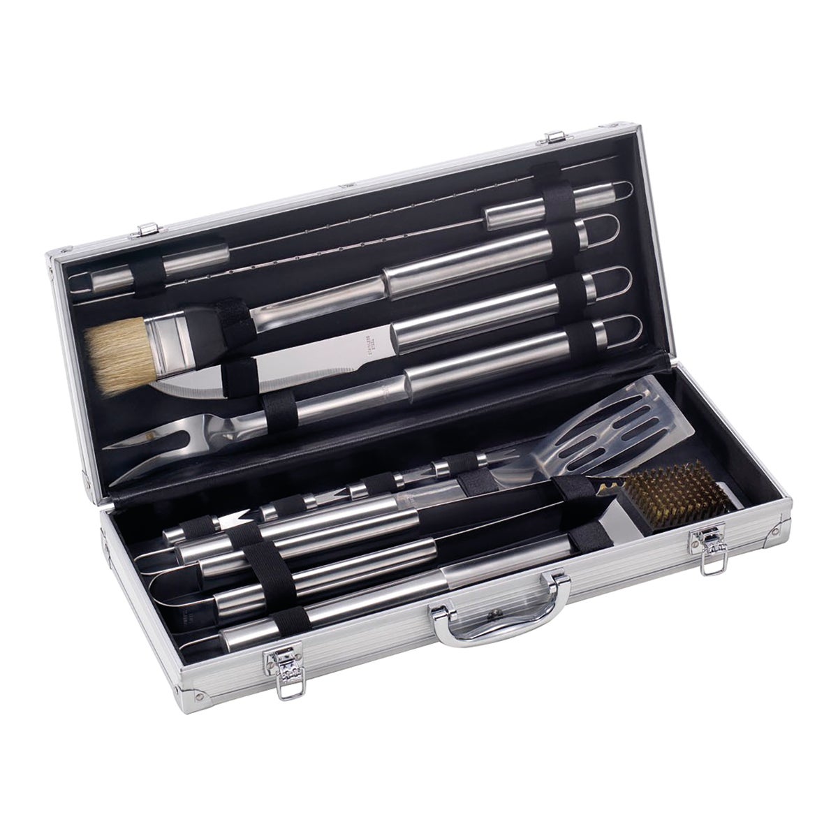 Valigetta portatile con set di 12 accessori barbecue in acciaio Inox. Ideali per il barbecue. Manico ergonomico, per una presa comoda e sicura. Accessori lavabili in lavastoviglie