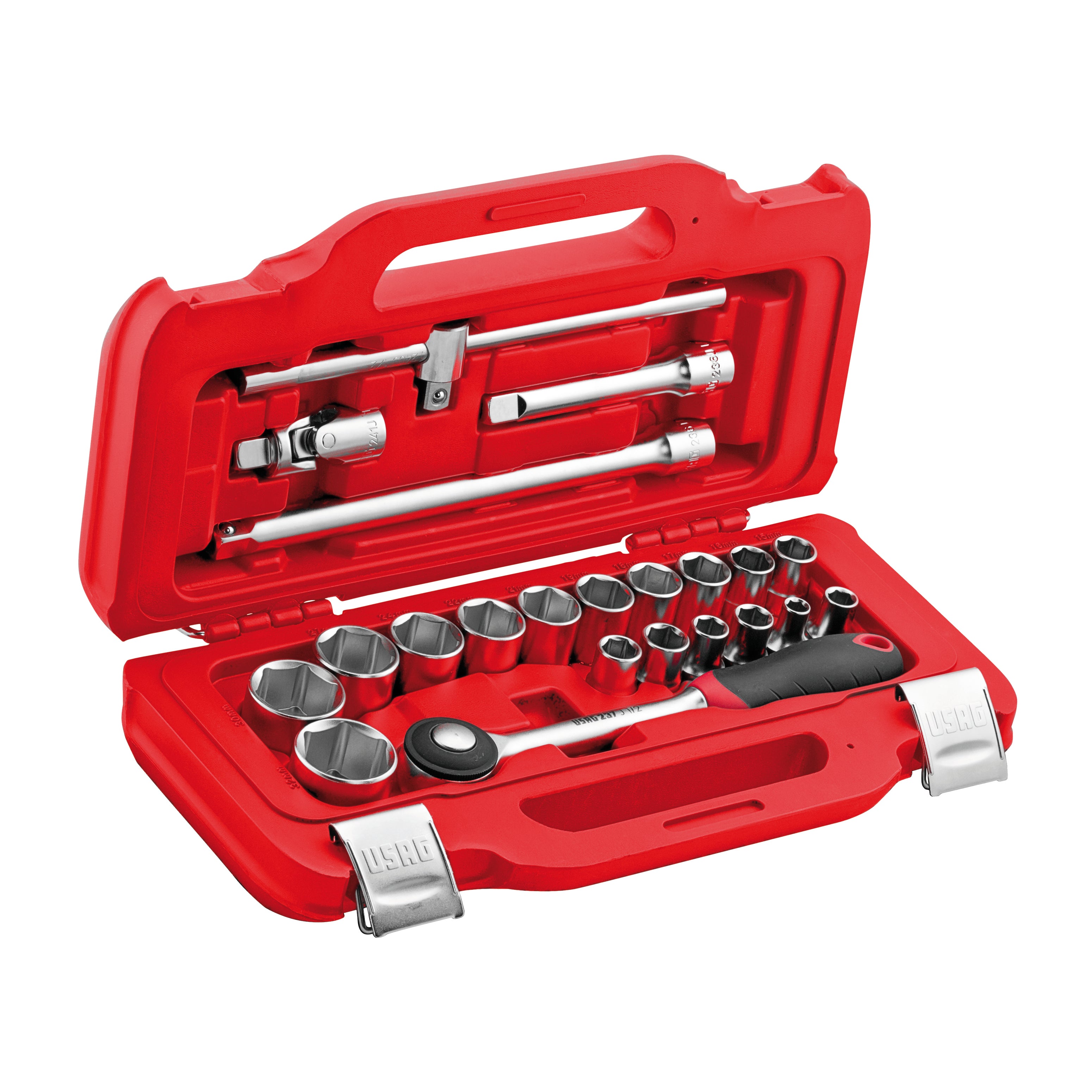 In acciaio al carbonio, set da 22 pezzi. Contenitore compatto in materiale plastico, con maniglia ergonomica integrata. Doppia clip di aggancio in metallo. CHIUSA la cassetta occupa lo spazio di 1 modulo portautensili, APERTA la cassetta occupa lo spazio di 2 moduli portautensili