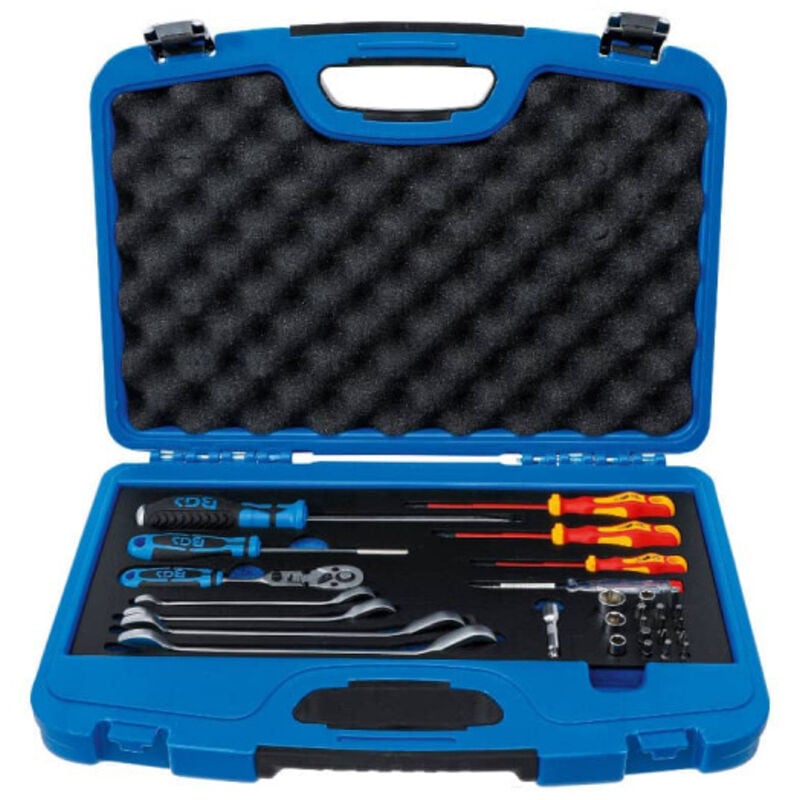 Per lavori su sistemi di riscaldamento, caldaie, armadi di controllo, servizi di costruzione, ecc. Adatto ai settori climatizzazione, sanitario e riscaldamento Nella pratica valigetta di sistema BGS con inserto in schiuma EPE 1/3 per l'uso mobile Utensili di forma compatta per l'uso in spazi ristretti Possibilità di applicazione universale grazie a svariati inserti per bussole, punte, adattatori, cacciaviti e chiavi a cricchetto di misure comuni Gli utensili isolati VDE (fino a 1000 V) permettono di lavorare in modo sicuro anche in aree ad alta tensione Oggetto della fornitura: 1 chiave combinata a cricchetto: | reversibile | 10 mm (BGS 6610) 1 chiave combinata a cricchetto: | reversibile | 13 mm (BGS 6613) 1 chiave combinata a cricchetto: | reversibile | 17 mm (BGS 6617) 1 chiave combinata a cricchetto: | reversibile | 19 mm (BGS 6619) 1 impugnatura portainserti | 6,3 mm (1/4) | 200 mm (BGS 217) 1 cacciavite | taglio 8 mm | lunghezza della lama 150 mm (BGS 4905) 1 cacciavite VDE |