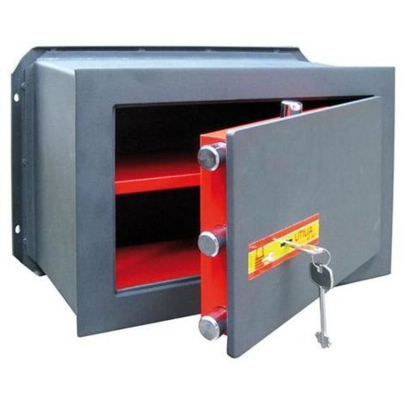 CASSAFORTI DA MURO TOP cm. 26x15,5x18 h • Solida struttura in acciaio verniciato mm. 3 con polvere epossidica • Porta con parete anteriore da mm. 8 con taglio laser • Serratura a due mandate con chiave a doppia mappa • 2 chiavi • Ripiano interno • Completa di tappetino sul fondo e gommini antiurto Dimensioni: cm. 26x15,5x18 h Dimensioni porta: cm. 12,5x19 2 catenacci orizzontali Ø mm. 18