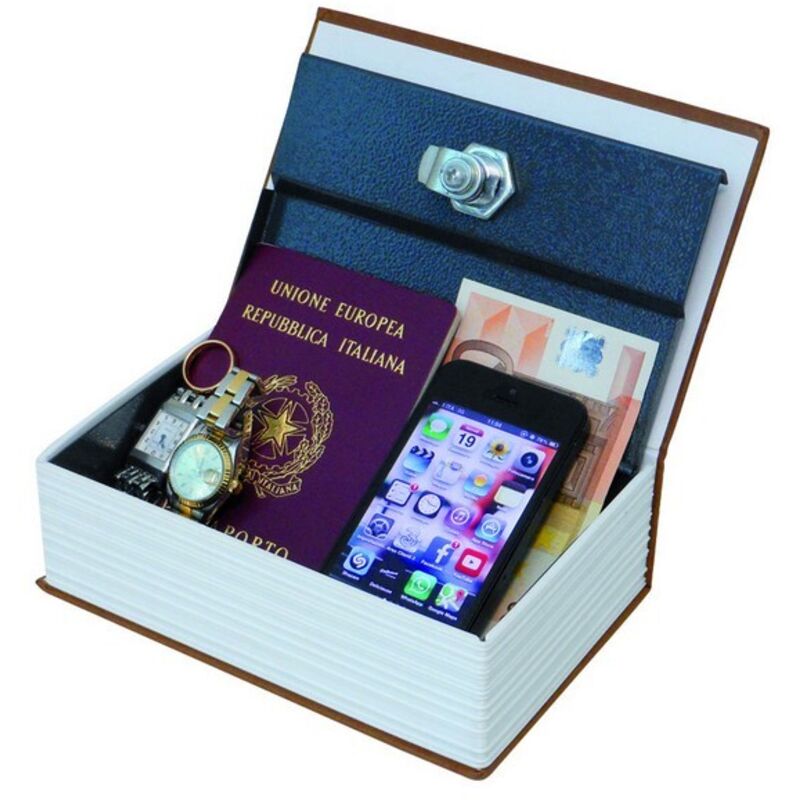 CASSETTA SICUREZZA A LIBRO MM 270X200X70 Ottima cassettina portavalori a forma di libro utilissima per custodire monete, banconote ma anche oggetti di piccole dimensioni che hanno un importante valore camuffandolo come libro agli occhi dei malintenzionati. Il prodotto e costituito in cartone pressato per le alette del libro e in metallo all'interno per la cassaforte affinché possa rimanere inviolato di fronte a possibili forzature. Per l'apertura e la chiusura dispone dell apposita chiave, la cui serratura e altrettanto resistente. Perfetto per magazzini, alberghi, luoghi commerciali, per la propria abitazione, per tutti coloro che viaggiano e per 1000 altri utilizzi. Caratteristiche tecniche: Cassetta portavalori a forma di Libro. Materiale: Metallo per la cassaforte all'interno e Cartone pressato per la copertina. Doppia chiave. Ottimo per monete, banconote o piccoli oggetti di valore. Misure: 270x200x70 mm