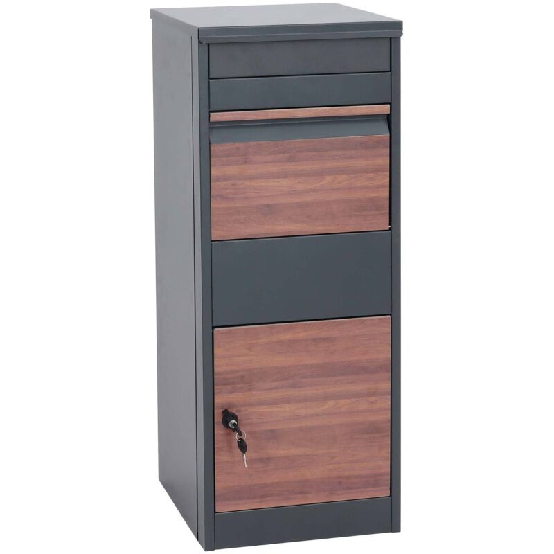 Merce non controllata da reso Cassetta postale per lettere e pacchi modello HHG-092 acciaio zincato colore ANTRACITE e LEGNO SCURO Se in futuro vuoi evitare lunghe code allo sportello postale, abbiamo la cosa giusta per te: Questa cassetta postale è adatta alla ricezione di lettere e di pacchi di piccole e medie dimensioni (fino a 36,5x33,5x25cm) Il sistema prevede l'apertura dello sportello per inserire il pacco, non appena lo sportello viene chiuso, il pacco cade nella parte inferiore della cassetta, dove il pacco non può essere preso senza prima dover aprire lo sportello con serratura. E' possibile fissare la cassetta postale al terreno mediante i fori presenti sulla piastra della base e utilizzando il materiale incluso nella consegna. Proponiamo questo articolo in diverse versioni. adatto per lettere e pacchi di piccole e medie dimensioni (fino a 36,5x33,5x25cm) con serratura con materiale e fori per il fissaggio al pavimento sistema di deposito sicuro peso 23kg materiale: acciaio
