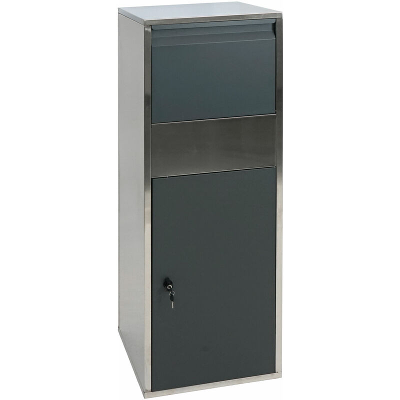 Merce non controllata da reso Cassetta postale per pacchi modello HWC-G80 XL acciaio inox colore ANTRACITE Se in futuro vuoi evitare lunghe code allo sportello postale, abbiamo la cosa giusta per te: Questa cassetta postale è adatta alla ricezione di lettere e di pacchi di piccole e medie dimensioni (fino a 47x37x25,5cm, max 23kg) Il sistema prevede l'apertura dello sportello per inserire il pacco, non appena lo sportello viene chiuso, il pacco cade nella parte inferiore della cassetta, dove il pacco non può essere preso senza prima dover aprire lo sportello con serratura. E' possibile fissare la cassetta postale al terreno mediante i fori presenti sulla piastra della base e utilizzando il materiale incluso nella consegna. Proponiamo questo articolo in diverse versioni. adatto per pacchi di piccole e medie dimensioni (fino a 47x37x25,5cm, max 23kg) con serratura, doppia chiave fornita consegnato già montato con materiale e fori per il fissaggio al pavimento sistema di deposito sicuro