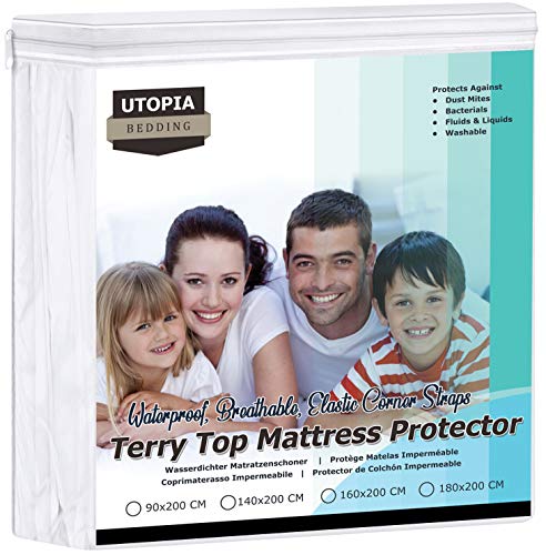 Utopia Bedding Coprimaterasso Impermeabile Terry Matrimoniale 160 x 200 cm, Traspirante Cotone Top Proteggi Materasso con Angoli Elastici Cinghie