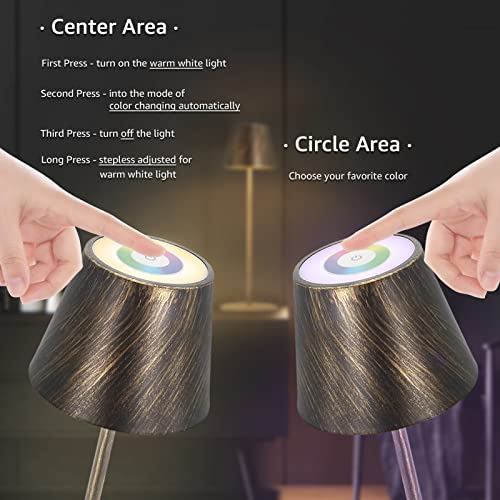 Tocca per attivare lampada touch lampada ricaricabile da tavolo per accendere/spegnere/regolare le luci. Premere a lungo la luce cambierà automaticamente colore. Puoi regolare liberamente la luminosità della lampada da tavolo nell'intervallo 5%-100%.Una varietà di colori RGB crea un'atmosfera piacevole.