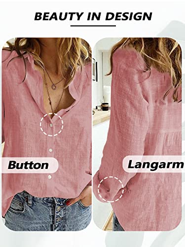 Uusollecy Camicetta Estiva da Donna, a Maniche Lunghe, Scollo a V, Casual, in Cotone, con Bottoni a Maniche Lunghe, Tinta Unita, per Donne e Ragazze A-Rosa. M