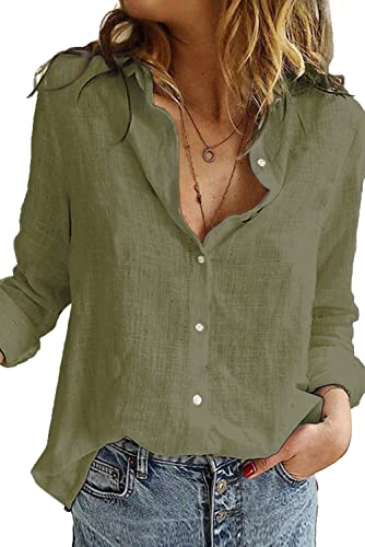 Uusollecy Camicetta estiva da donna, a maniche lunghe, scollo a V, casual, in cotone, con bottoni a maniche lunghe, tinta unita, per donne e ragazze, A-verde, M