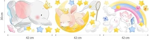 Kina - UVB00560 Adesivi Murali Cameretta Bambino stampati su PVC Trasparente Decorazione Elefante e Coniglio Nuvole Muro Asilo Nido - Misura Tre fogli 40x30 cm