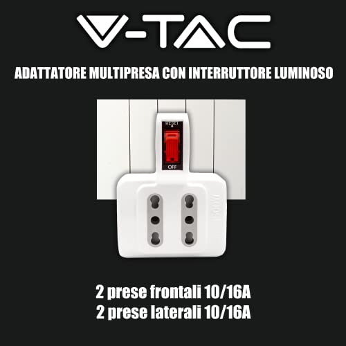 V-TAC Adattatore Tripla Presa Elettrica 4 Posti con Interruttore Salvaspazio - 2 Prese Laterali e 2 Frontali 10/16A Bipasso - Multipresa per Casa, Ufficio, Spina 10A - Bianco